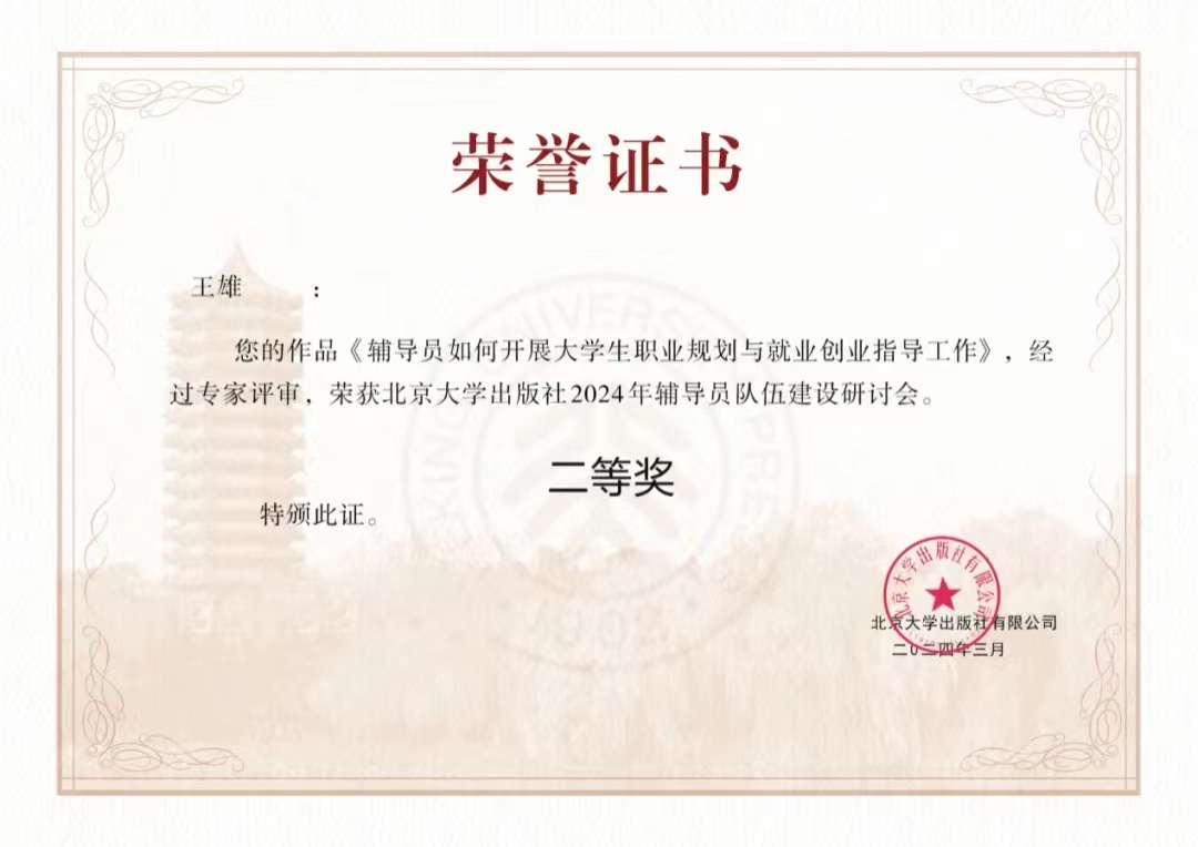 2024年3月30日至31日,由北京大学出版社主办的“2024 年辅导员队伍建设研讨会”在江西南昌圆满举办。我院辅导员王雄撰写的论文《辅导员如何开展大学生职业规划与就业创业指导工作》荣获二等奖。此次研讨会旨在提升辅导员的专业素养和工作能力,促进辅导员队伍的建设与发展。