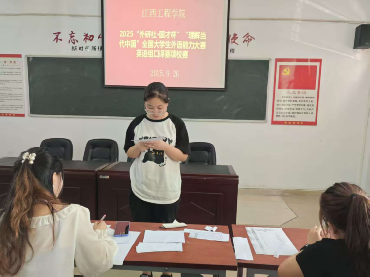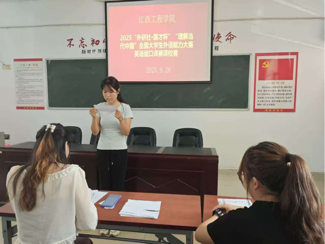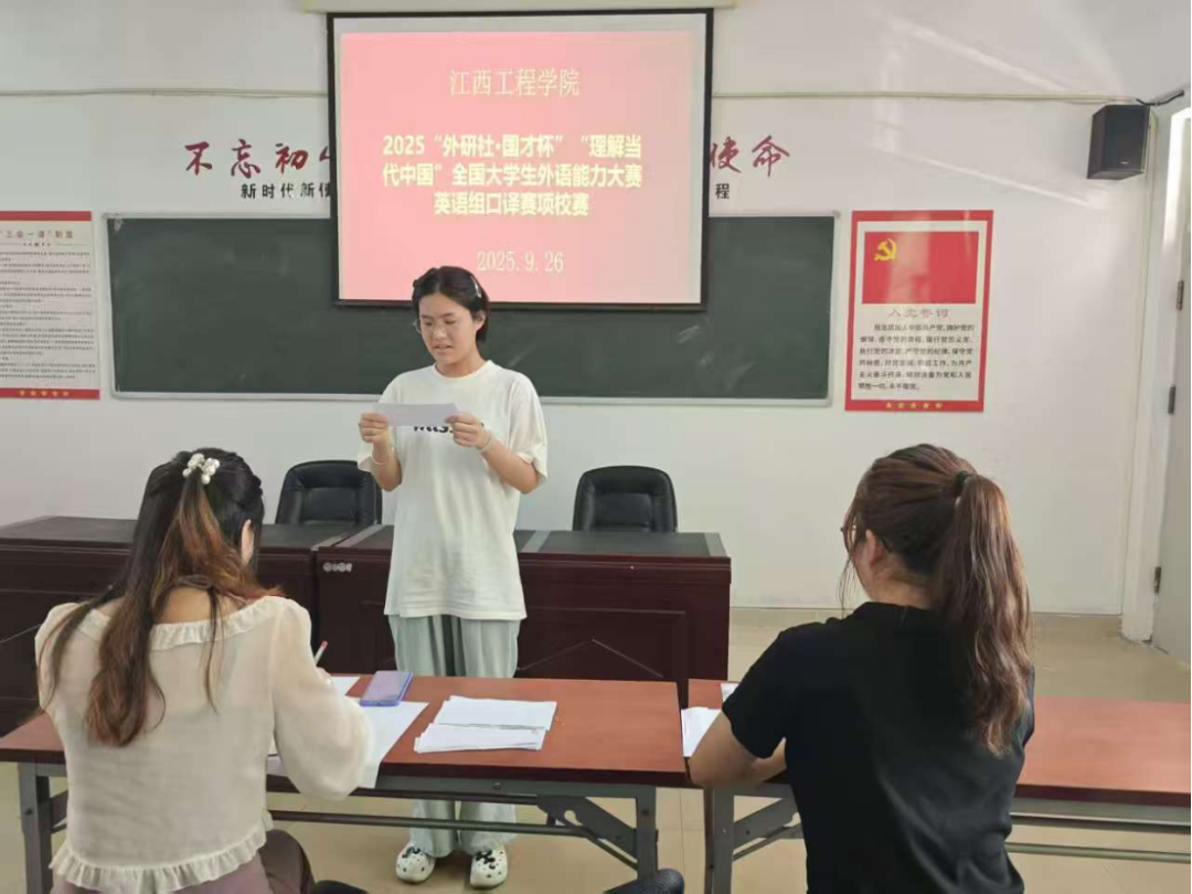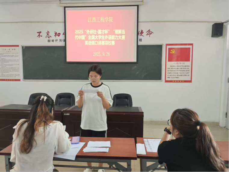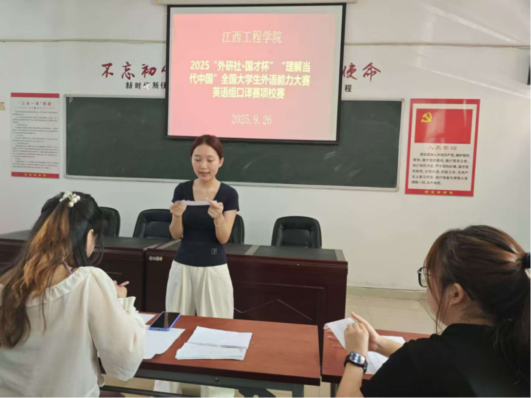 为提升学生外语应用能力,培养具有国际视野与中国情怀的复合型人才,9月26日下午两点,江西工程学院于C201举办2025年“外研社·国才杯”“理解当代中国”全国大学生外语能力大赛英语组口译赛项校赛。