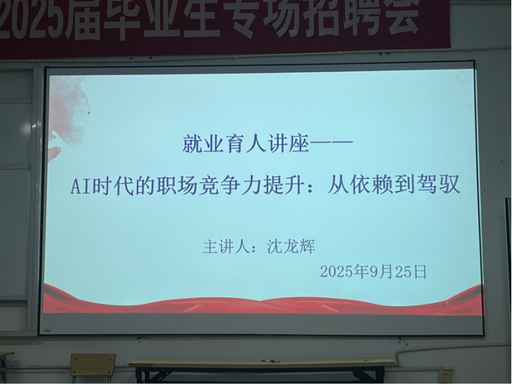 为助力大学生在AI时代提升职场竞争力,更好地规划职业发展,9月25日,一场主题为“AI时代的职场竞争力提升:从依赖到驾驭”的就业育人讲座在D106顺利开展,本次讲座由副教授沈龙辉主讲,商务英语和网络与新媒体专业的大二、大三学子积极参与。