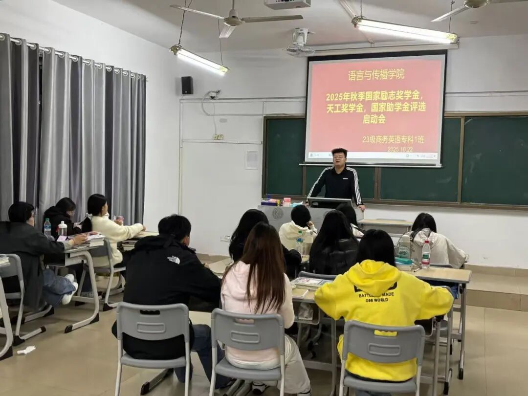 为切实做好2025年秋季国家励志奖学金、天工奖学金及国家助学金的评选工作,保障家庭经济困难学生顺利完成学业,激励学子勤奋进取,语言与传播学院于10月20日召开2025年秋季国家励志奖学金、天工奖学金、国家奖助学金启动会,本次会议由学院院长车凤英主持,党总支书记谢丽丽、党总支副书记王雄及全体辅导员参会。会后各班级陆续开展班会,确保奖助学金政策宣传全覆盖、评选流程全透明。