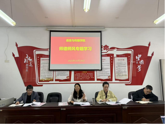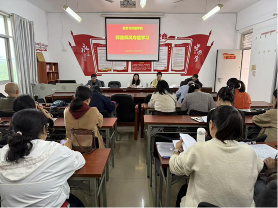 为筑牢教师职业根基,营造风清气正的育人环境,10月29日,语言与传播学院(国际教育学院)在C401开展“坚守师德初心,担当育人使命”师德师风专题学习会议,此次会议由学院党总支书记谢丽丽主持,全体教师共同参与。