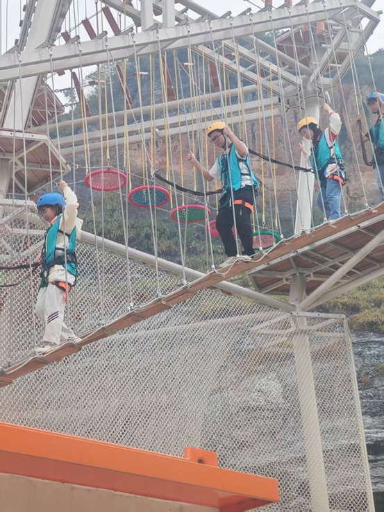 最后,三支队伍在各负责人的带领下,分别参加了彩虹滑道、矩阵探险、步步惊心等紧张又刺激的环节。彩虹滑道项目让同学们体验了速度与激情的碰撞,大家坐在特制的滑板上,从高处飞驰而下,感受着风在耳边呼啸,尖叫声与欢笑声此起彼伏,将内心的压力彻底释放。矩阵探险环节则考验了同学们的勇气与智慧,面对看似悬空的步道,同学们需要克服内心的恐惧,小心翼翼地迈出每一步,每一次成功跨越都让同学们的自信心得到极大提升。步步惊心环节更是把气氛推向了高潮,同学们行走在搭建在高空中的狭窄通道上,脚下是深不见底的“深渊”,每一步都走得胆战心惊,但彼此间的鼓励与支持让大家鼓起勇气,最终顺利通关。