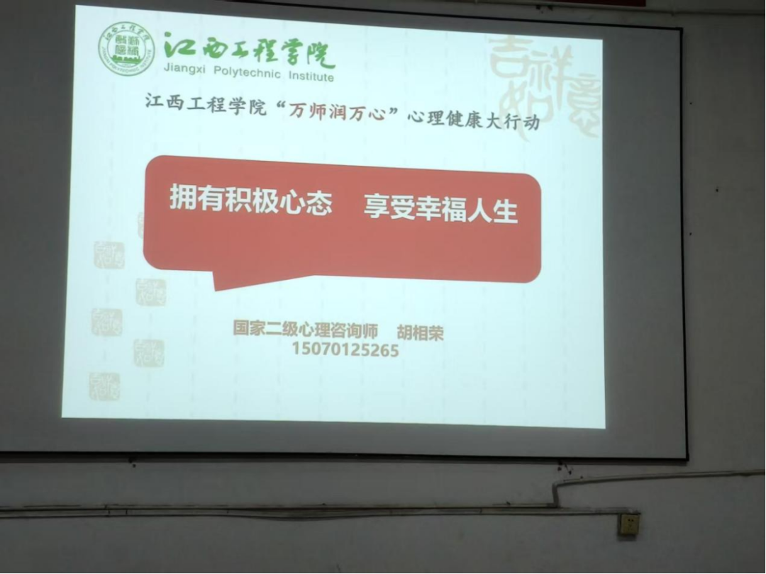讲座伊始,胡相荣老师以“拥有积极心态,享受幸福人生”为题,从大学生常见的心理困扰、情绪管理技巧、人际关系处理、压力应对策略等方面展开,结合生动有趣的案例,深入浅出地讲解了大学生如何正确认识和接纳自我,如何培养积极乐观的心态,如何建立良好的人际关系,如何有效应对学习和生活中的压力。