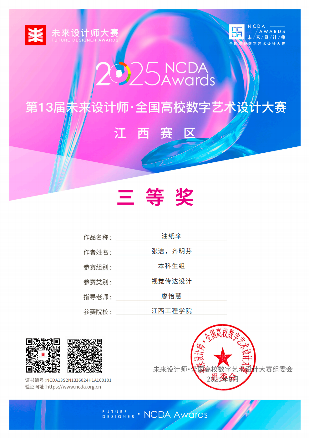 经过激烈角逐,由张洁、齐明芬同学共同创作的海报设计作品《油纸伞》脱颖而出,荣获本届大赛省级三等奖。该作品以其独特的文化视角和精妙的视觉呈现,赢得了评委的认可。