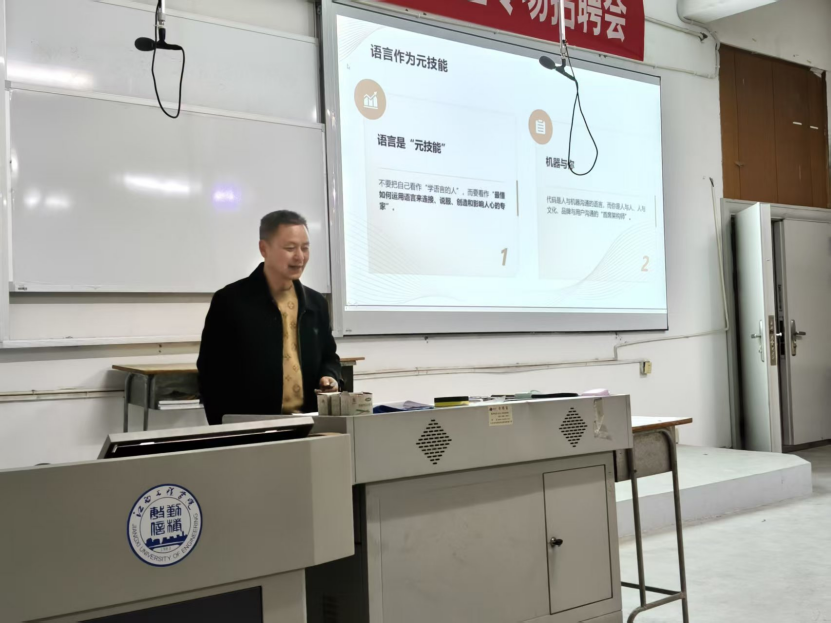 随后,桂老师围绕“语言价值转化的核心逻辑”“真实企业岗位中的语言应用”“信息到价值的实践路径”等内容展开讲解——全程使用真实公司、真实岗位名称,让同学们直观感受到“语言价值”的落地场景,充分认识到语言不仅是沟通工具,更是创新创业中的核心能力。