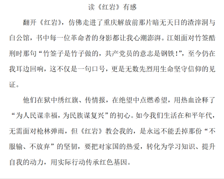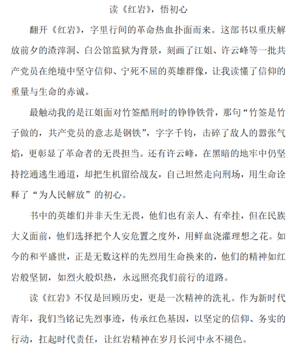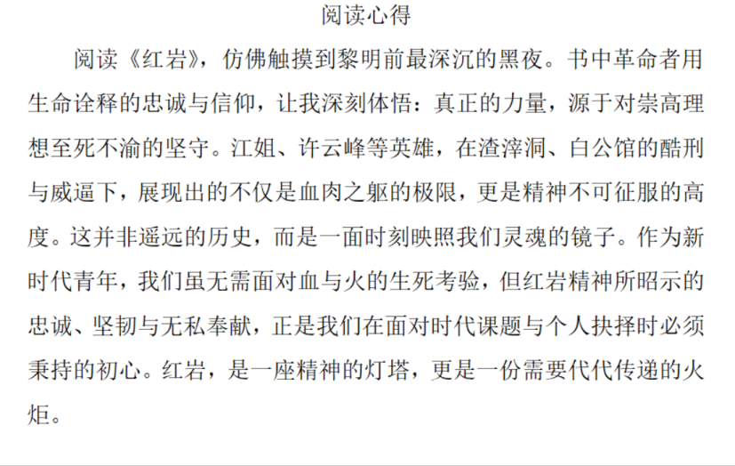 经过专业评委的严格评审,本次阅读心得评比最终评选出多篇优秀作品。这些文章或笔触真挚、情感饱满,或见解深刻、立意高远,生动诠释了红色精神的时代价值。以下是几篇优秀心得: