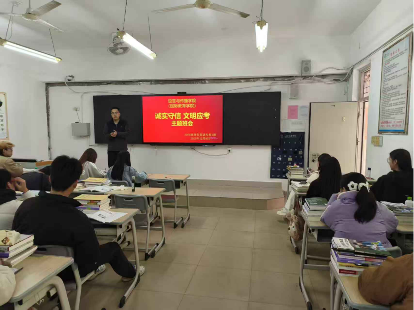 为进一步加强考风考纪教育,引导学生树立诚信应考的观念,营造公平公正、风清气正的考试氛围,近日,语言与传播学院(国际教育学院)各班级陆续开展“诚信考试 文明应考”主题班会。