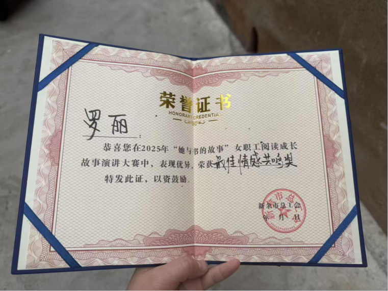 2025年12月30日,新余市工会主办的“她与书的故事”全市女职工阅读成长故事演讲大赛圆满落幕,我院罗丽老师凭借出众表现脱颖而出,荣获“最佳情感共鸣奖”。