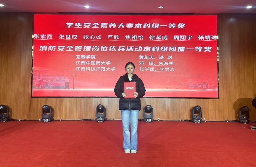 热烈祝贺我院张心如同学在江西省首届大学生安全素质大赛中凭借扎实的安全知识储备、出色的临场应变能力,一路过关斩将,荣获一等奖的优异成绩!