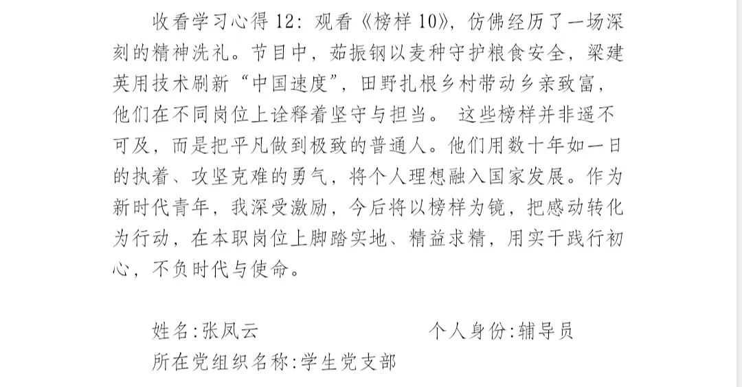 此次观看《榜样10》专题节目,是学院深化主题教育、强化党员教育的重要举措。通过榜样的示范引领,让红色精神与时代力量在师生心中深深扎根,进一步激发了全体党员的责任感与使命感。
