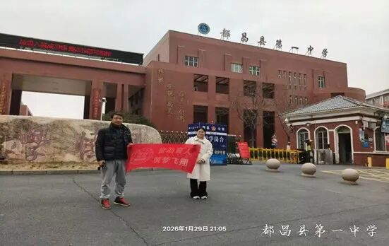 在宣讲开始前,我还和一同前来的老师在都昌一中校门口合影,红色的“资助育人·筑梦飞翔”横幅在夜色里格外醒目,也让我更加坚定了传递温暖的决心。