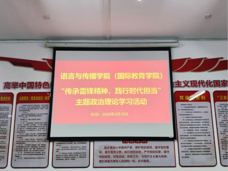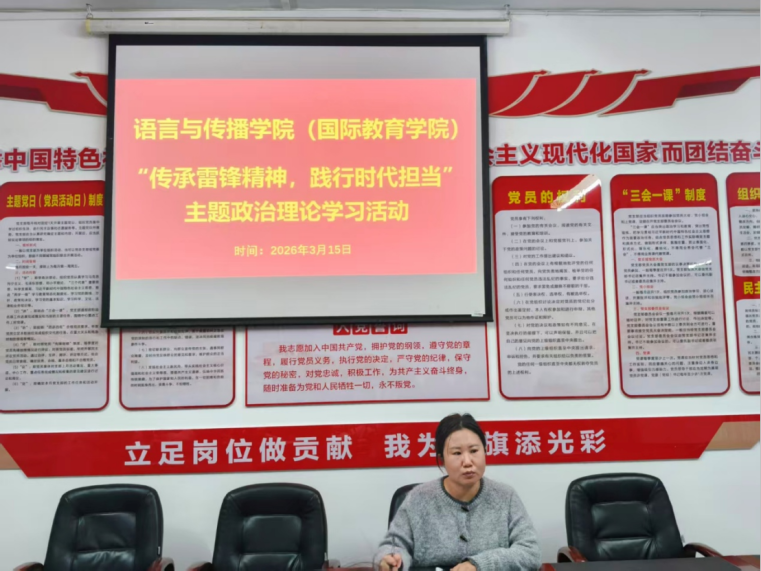 为深入学习贯彻习近平总书记关于弘扬雷锋精神的重要指示精神,引导全体党员与师生感悟雷锋精神的时代内涵,凝聚奋进力量,2026年3月15日,语言与传播学院(国际教育学院)以“北斗星·红传”党建品牌建设为引领,组织开展“传承雷锋精神,践行时代担当”主题政治理论学习活动。本次活动由学院团总支书记胡金梅主持,全体党员、入党积极分子及学生代表共同参与。