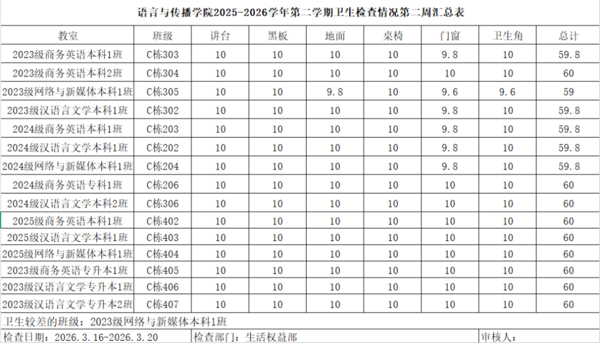 本次教室卫生检查不仅是对学校教学环境的一次全面审视,更是对学生卫生习惯的一次重要考验。希望各班重视并向好的班级学习,为学院各班级共同营造一个整洁、舒适、高效的学习环境。