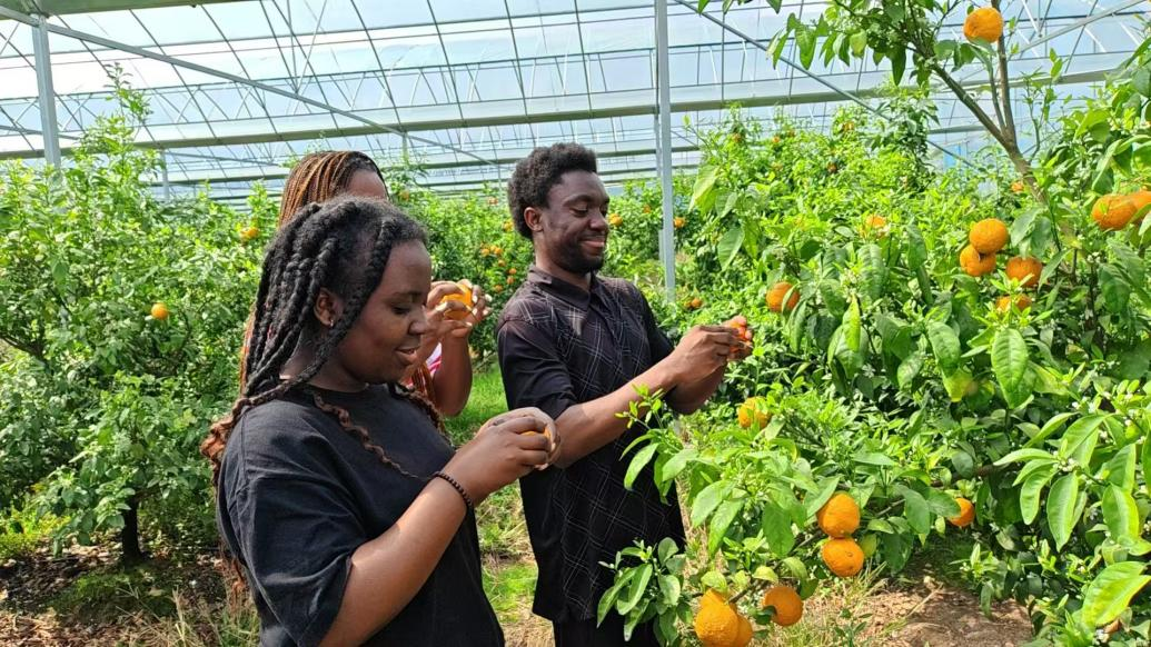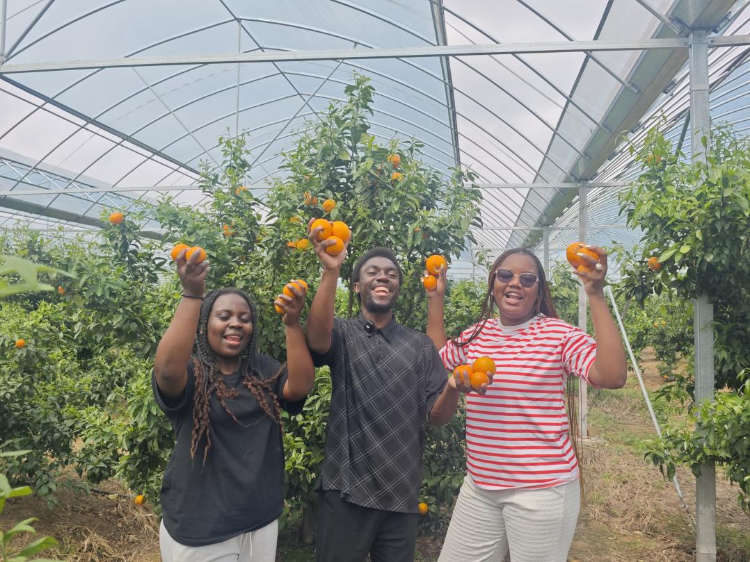 活动的首站,师生们来到珠珊镇洲下村沃柑种植基地。在这里,留学生们不再是课堂上的听众,而是乡村振兴现场的观察者与提问者。基地负责人系统介绍了当地通过“合作社+农户”模式,集成科学管理与生态技术,发展绿色循环农业的生动实践。面对挂满枝头的累累硕果,留学生们兴致盎然地询问种植技术、市场销路与农民收益,对“绿水青山就是金山银山”的科学论断有了最直观、最深刻的认识。胡亚文老师在现场教学中指出,中国的乡村振兴是产业、科技、文化协同推进的系统工程。留学生们通过亲手触摸果实、品尝甘甜,真切感受到了中国农业现代化的扎实步伐与丰硕成果。