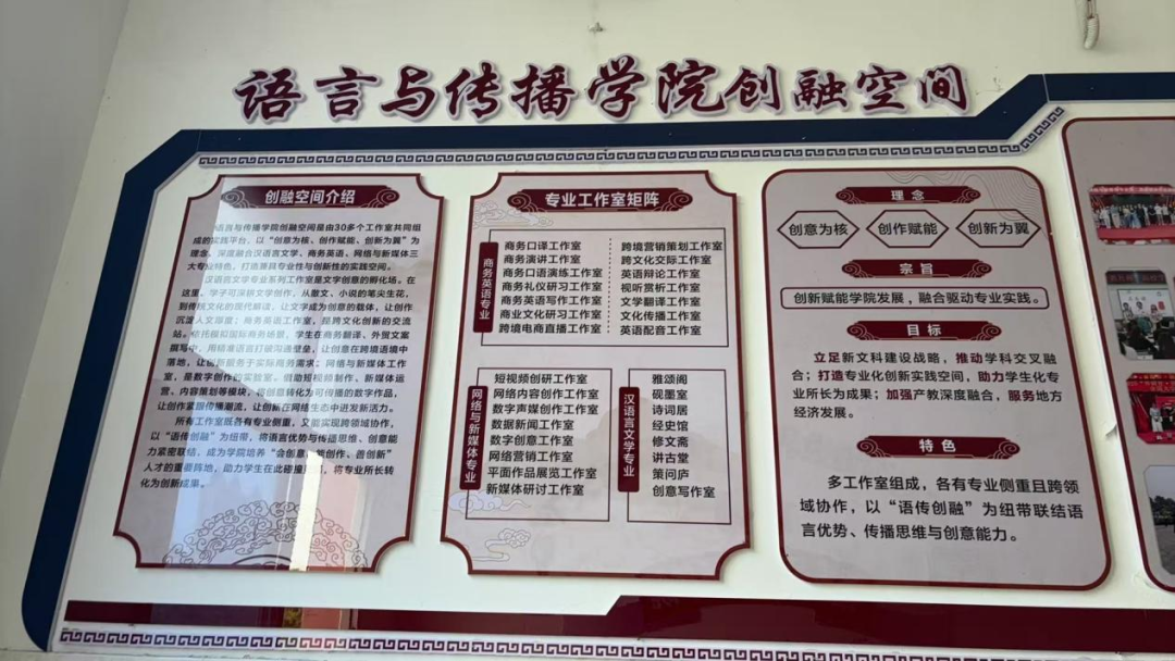 学院创融空间由30多个专业工作室共同组成,深度融合汉语言文学、商务英语、网络与新媒体三大专业特色,打造兼具专业性与创新性的实践空间。各工作室既各有专业侧重,又能实现跨领域协作,以“语传创融”为纽带,将语言优势与传播思维、创意能力紧密联结,成为学院培养“会创意、能创作、善创新”人才的重要阵地。